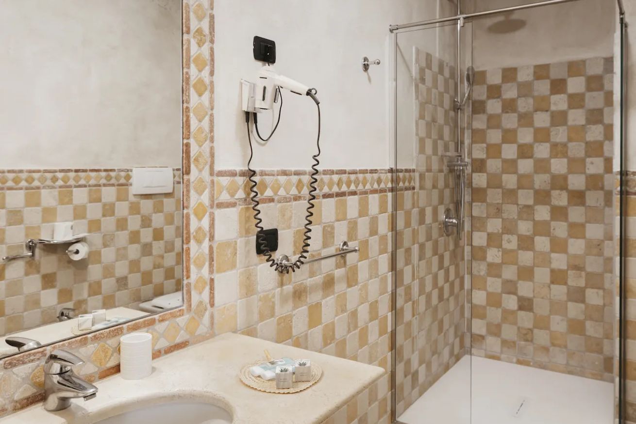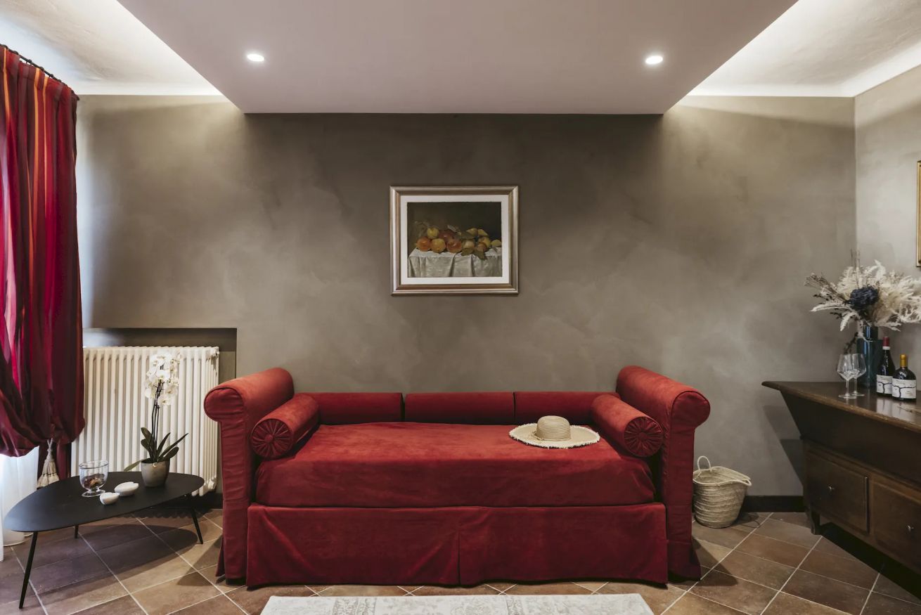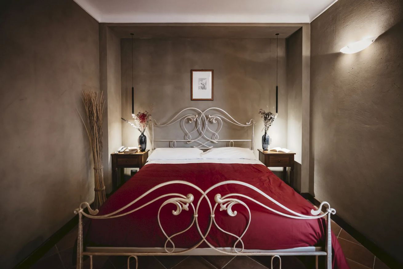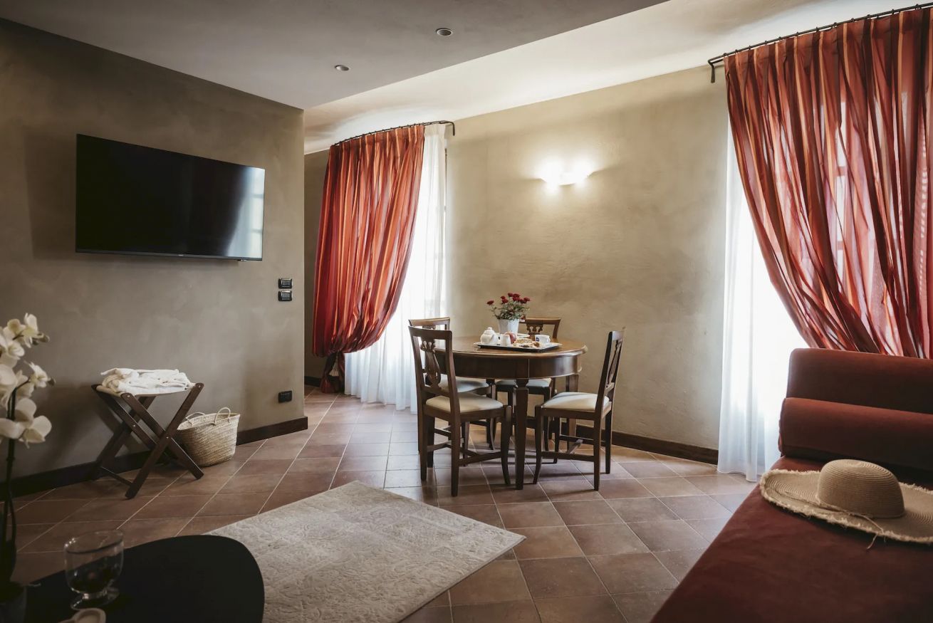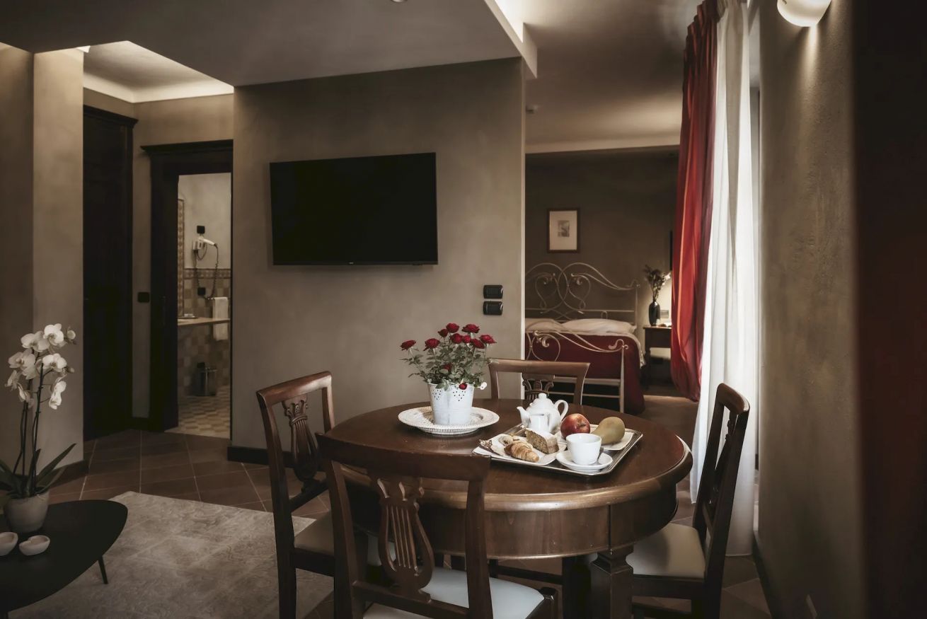 Camera Suite con 1 letto matrimoniale ed 1 o 2 letti singoli (su richiesta), vasca in camera, bagno privato con doccia, 38 metri quadrati, con balconcino e vista sui vigneti retrostanti.